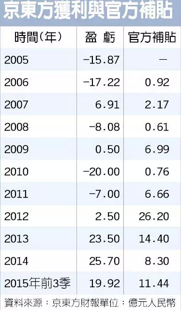 盡管全球面板業(yè)景氣陷入寒冬期,但國(guó)內(nèi)廠商卻者卻無(wú)懼寒風(fēng)刺骨,原因無(wú)他,得益于中央到地方的龐大的資金補(bǔ)貼,反而使企業(yè)能趁機(jī)擴(kuò)張。最具代表性的業(yè)者,當(dāng)屬A股上市企業(yè)京東方。自京東方上市至今,已獲得逾70億元人民幣(下同),約合超過(guò)350億新臺(tái)幣的政府補(bǔ)貼。
