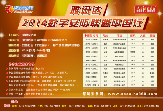 隨著2013年的結(jié)束,雅迅達(dá)2014數(shù)字安防聯(lián)盟中國(guó)行即將啟動(dòng),而前期營(yíng)銷宣傳這場(chǎng)不見硝煙甚至是不動(dòng)聲色的戰(zhàn)役已悄然發(fā)動(dòng)!