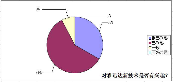 在針對雅迅達本次發(fā)布的三項技術(shù)——預(yù)監(jiān)回顯、自動刷新頻率和自動調(diào)節(jié)背光亮度——關(guān)注度調(diào)查中,29.7%的客戶表示很感興趣,52.7%的客戶表示感興趣,一般感興趣的為6.8%。在新技術(shù)在項目投標(biāo)控標(biāo)中的表現(xiàn)預(yù)測調(diào)查中,超過一半客戶認(rèn)為新技術(shù)能夠有效控標(biāo),將對項目的競標(biāo)成功產(chǎn)生積極作用。從數(shù)據(jù)看來,本次雅迅達中國行上海站活動表現(xiàn)成功,新技術(shù)的市場反應(yīng)良好。