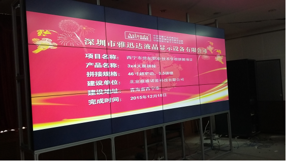 在該液晶拼接屏案例中,西寧市世紀(jì)職業(yè)技術(shù)學(xué)校采用了雅迅達(dá)的第四代46寸窄邊液晶拼接屏,并以3x4拼接單元的方案,落地支架安裝的方式組成了一面液晶屏拼接墻。